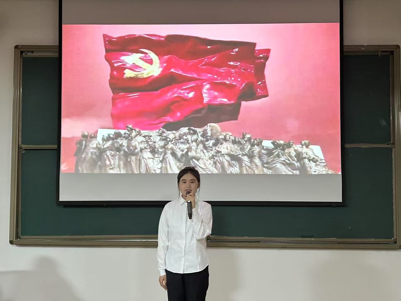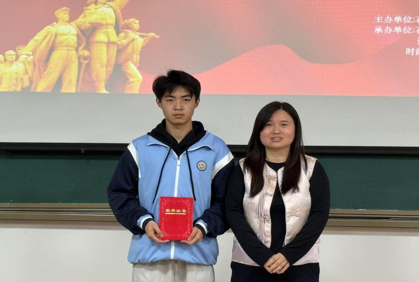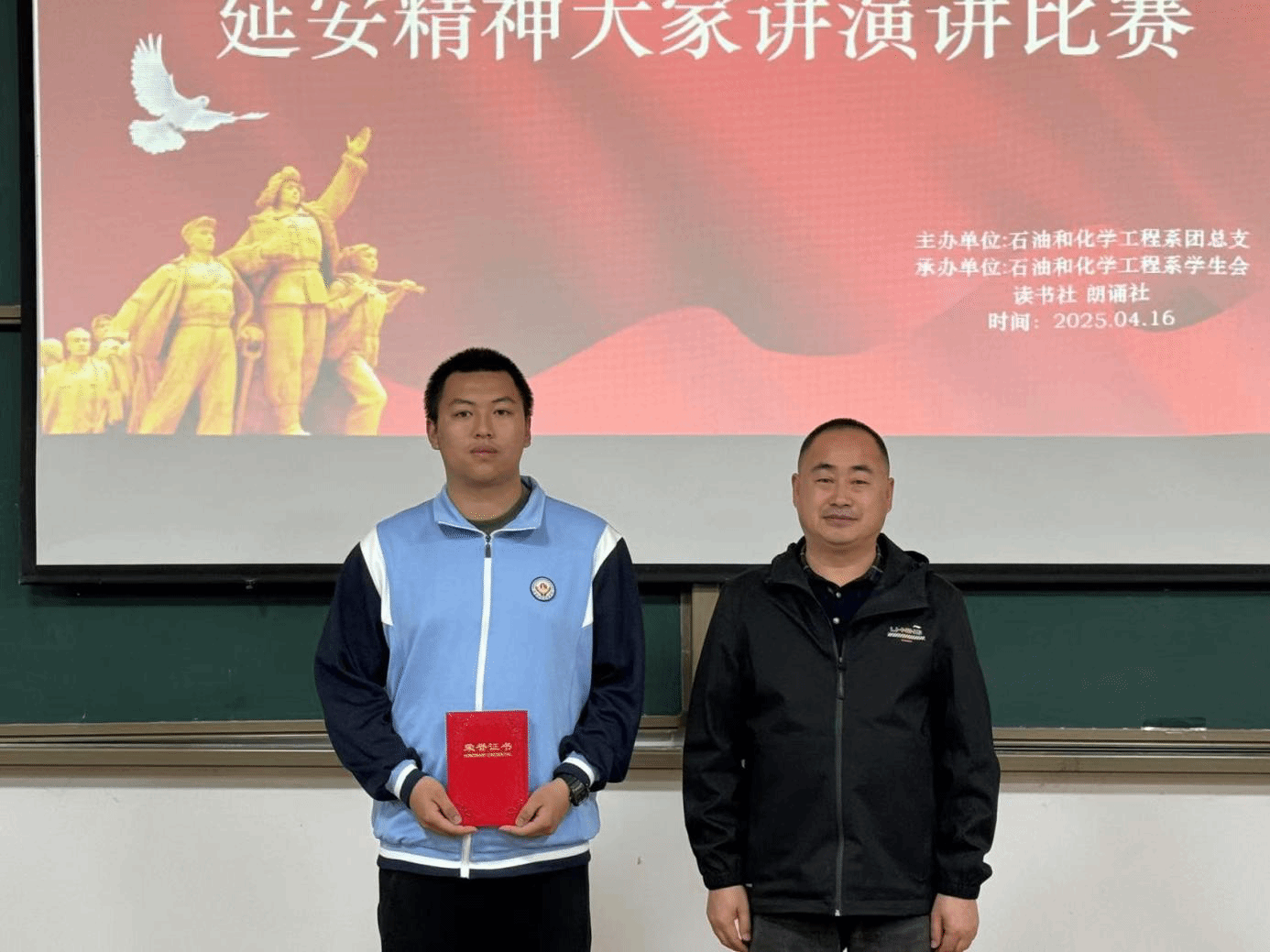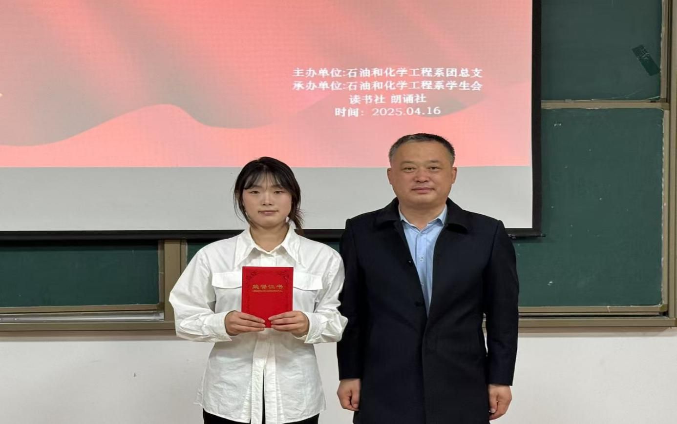 颁奖环节将现场氛围推向了新的高潮。石油和化学工程系系主任徐仿海老师为获得第一名的刘思雨同学颁奖,刘思雨同学凭借出色的表现,深刻诠释了延安精神,赢得了在场师生的一致认可。