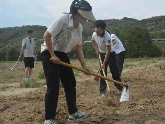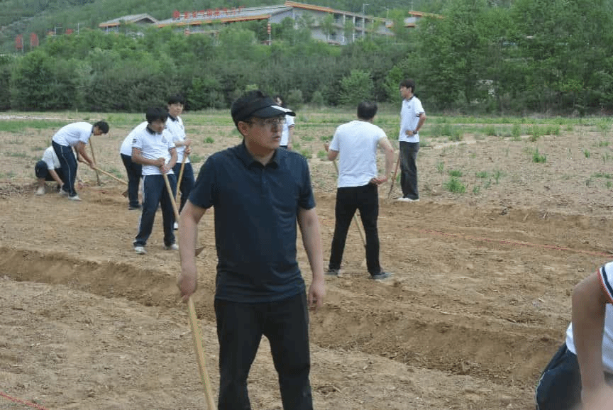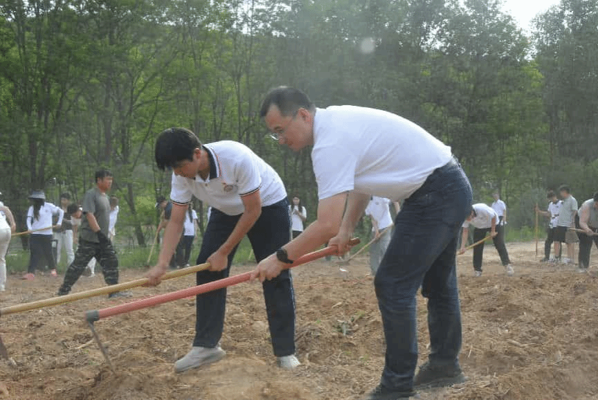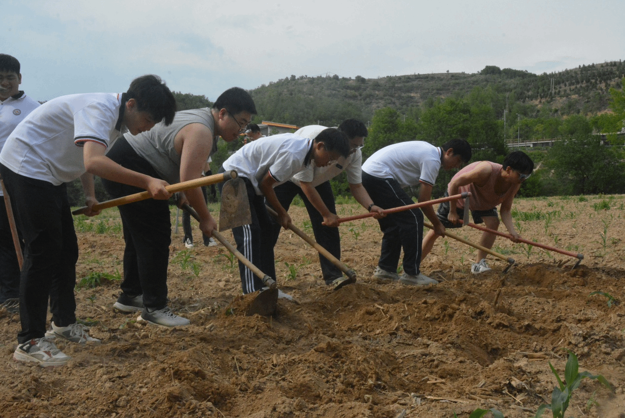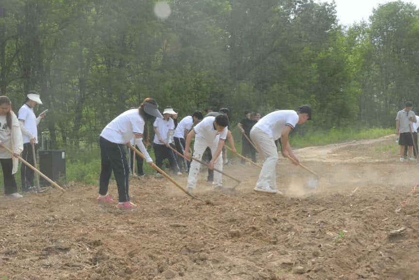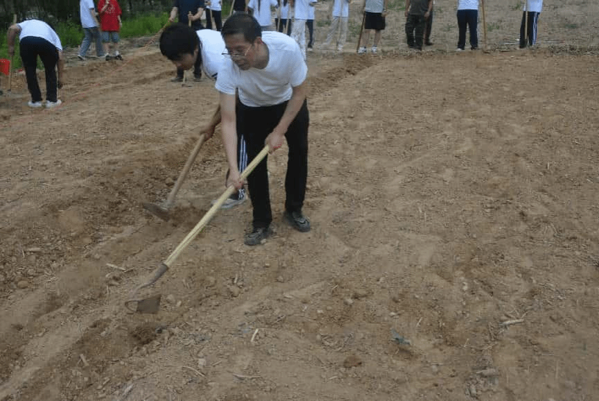 学生们紧随其后,干劲十足,他们分工协作,有的细心清理田地石块,有的在除草,有的在播种,镰刀锤头与铁镐交相辉映,党旗团旗在辛勤劳作的身影旁高高飘扬。
