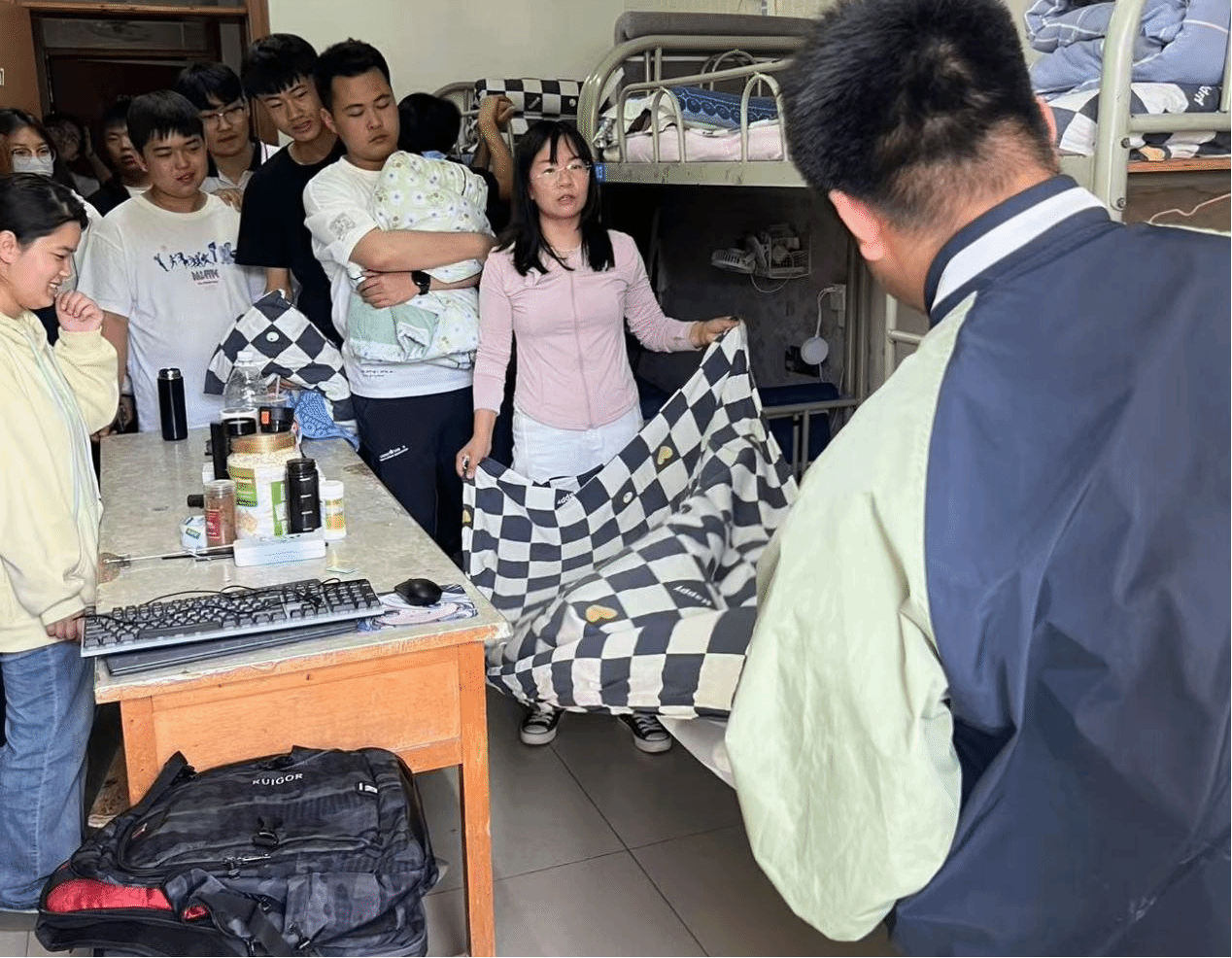 宿舍是学生生活学习的重要场所,也是劳动教育的重要阵地。在内务整顿方面,南迪老师亲自带队,现场示范叠被子,亲授宿舍整理秘籍。