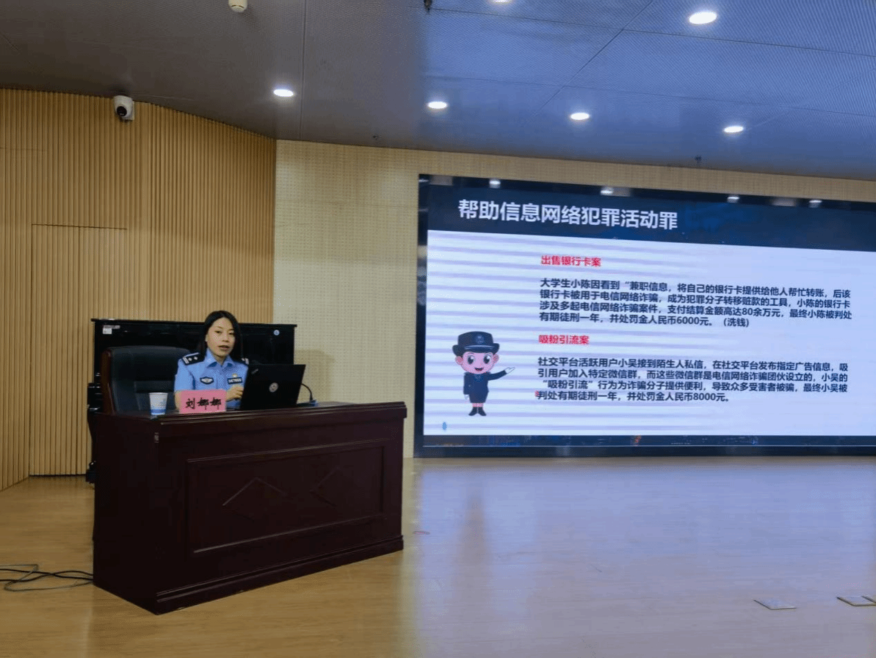 讲座中,刘娜娜警官凭借丰富的法律实践经验与扎实的专业知识,围绕校园安全核心问题,以贴近学生生活的案例为切入点,对校园暴力、电信诈骗、网络安全、消防安全、交通安全等内容进行了深入浅出的讲解。